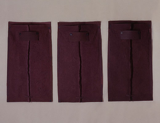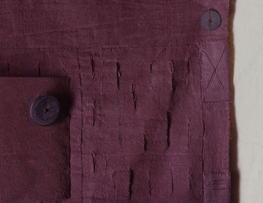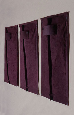 Calico, linen threads, leather, tacks, buttons, acrylic paint.